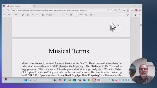 Music has 3 things that make it music. It has pitch, duration and expression. The pitch has to do with the notes going up and down on the page. This is what this class is about. You will learn the notes on the staff as it relates to the notes on the bagpipe chanter. At the end of this class you will have no problem recognizing the notes on the staff. It will take you about 30 minutes to do. All you need is a pencil. There are 2 .pdf files. One contains the worksheets and the other contains the answers to the worksheets. Download and print the 2 files attached. Use the "reading music" file first. No cheating now!